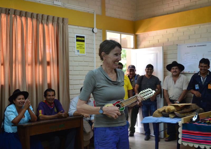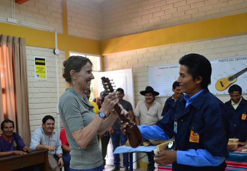 Los participantes de la carrera de Construcción de Charangos dieron un presente a la jefa de Cooperación, quien rasgo las cuerdas de un Walaycho, Charango pequeño y de sonido juguetón.