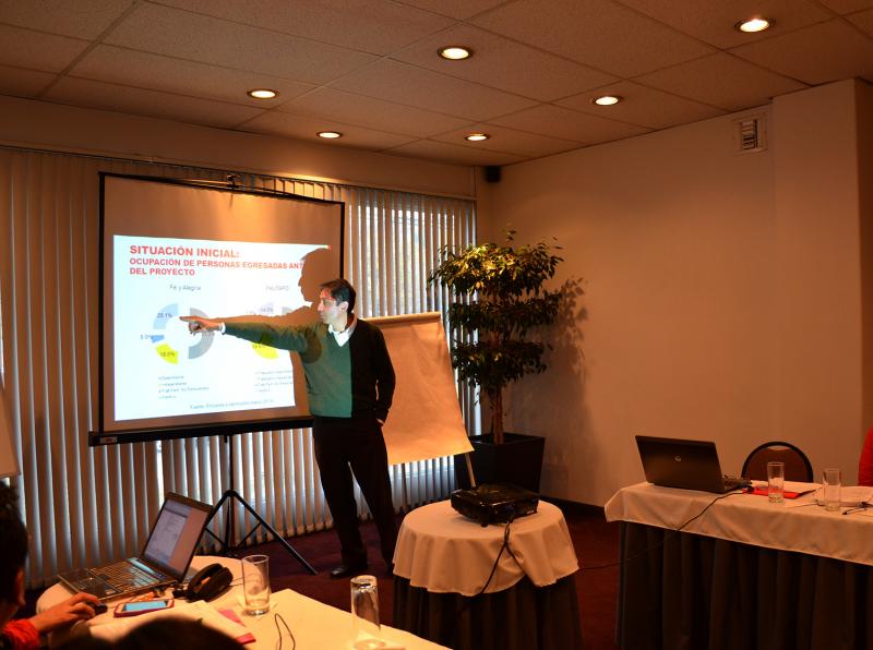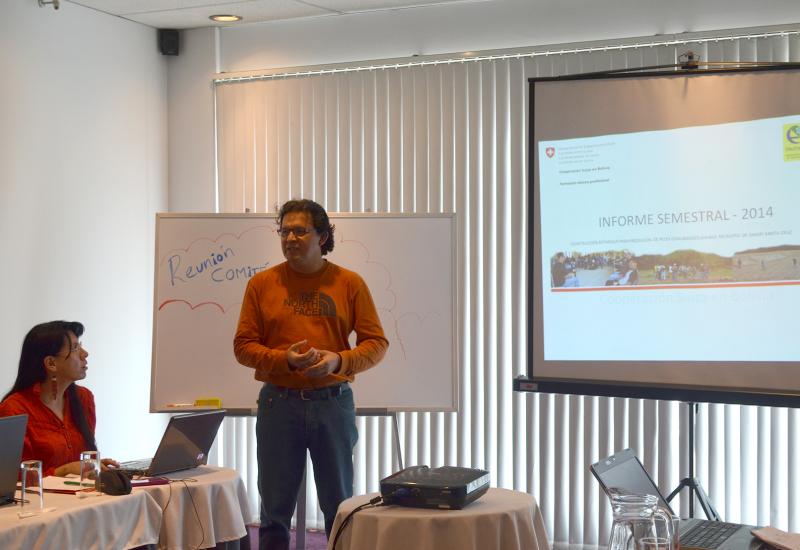 Miguel Vera, responsable de Monitoreo y Evaluación del proyecto, mostró las estadísticas del proyecto en cuanto a avances sobre número de personas que participan en formación técnica, centros que son apoyados por la Cooperación suiza y otros. Destacó que el proyecto recientemente incursiona en la formación de personas en zonas periurbanas, en Institutos Técnicos Superiores y con poblaciones indígenas.