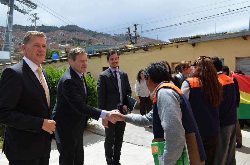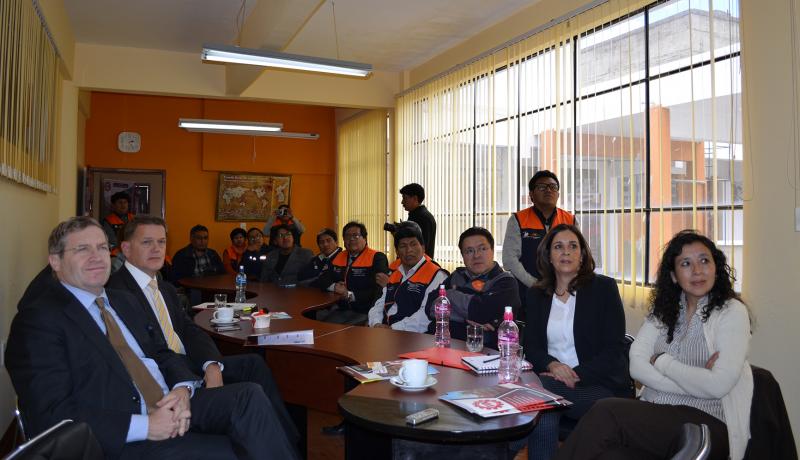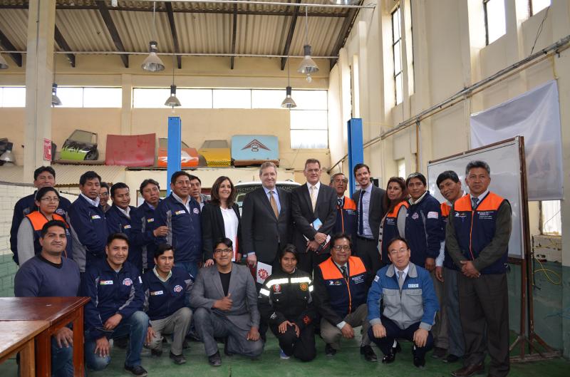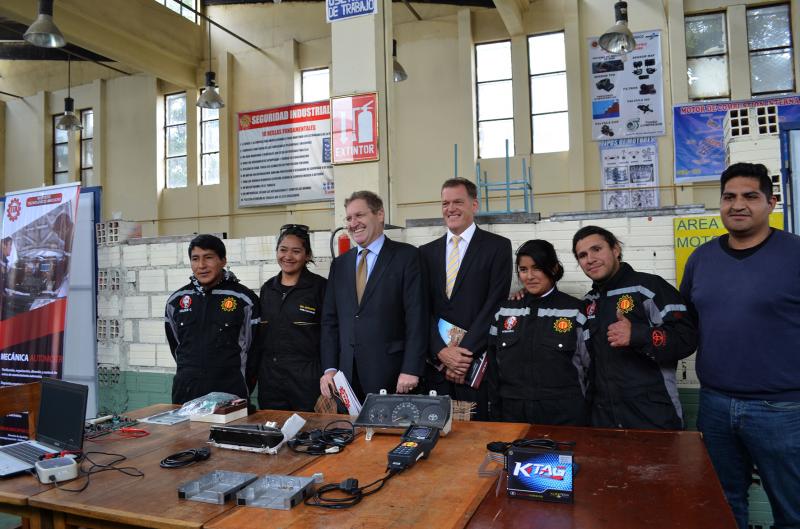 La visita de la comitiva Suiza estuvo conformada por Bénédict de Cerjat, Secretario de Estado Adjunto para las Américas; Gregory Ryan, Coordinar Regional Adjunto y; Roger Denzer, Embajador de Suiza en Bolivia quienes pudieron apreciar las acciones de apoyo que se realizan en este Instituto, como una muestra de la contribución que realiza el Gobierno Suizo a la formación técnica profesional en Bolivia en el marco de las políticas públicas del Estado Plurinacional de Bolivia que orientan la educación sociocomunitaria productiva.