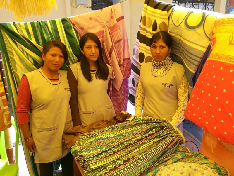 Parte de las participantes de la carrera de corte y confección exponen lo que aprendieron. Según la docente de la carrera, Victoria Apaza, las participantes llevan las telas para aprender, algunas venden lo que hacen y otras usan las prendas que confeccionan.