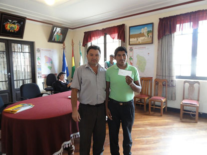En la fotografía el Honorable Alcalde Municipal de Vallegrande, Téc. Agr. Casto Romero Peña, felicita al joven emprendedor Santos Cuellar Ignacio. Indicar que el acto contó también con la presencia del Dr. Lorgio Salazar Mercado, presidente del Honorable Consejo Municipal de Vallegrande.