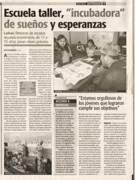 Ayudar a su familia, inspirar a sus hermanos, colaborar al progreso del país y ser independientes son algunos de los sueños y esperanzas de los estudiantes de la Escuela Taller Municipal de La Paz. En ese establecimiento, las personas de escasos recursos económicos, de 17 a 35 años, son beneficiarios con una capacitación técnica gratuita.
