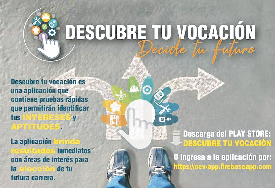 Nota: La plataforma virtual de Descubre tu vocación la encuentra en el sigueinte link https://oev-app.firebaseapp.com/ y tambén se dispone de la misma para sistema Android que puede ser descargada desde el Play Store. Esta es una iniciativa del proyecto Formación técnica profesional de la Cooperación Suiza en Bolivia que es ejecutado por Swisscontact-FAUTAPO.