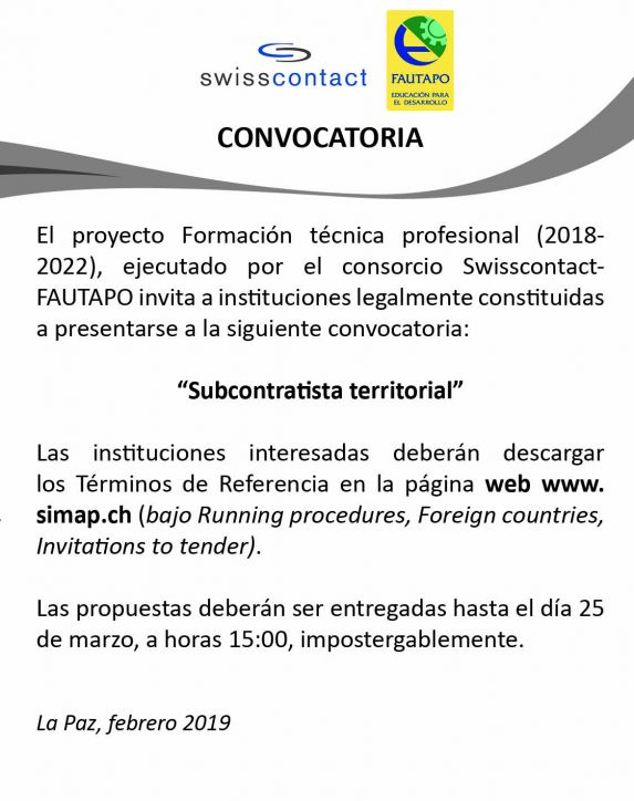 El proyecto Formación técnica profesional (2018-2022), ejecutado por el consorcio Swisscontact-FAUTAPO invita a instituciones legalmente constituidas a presentarse a la siguiente convocatoria: