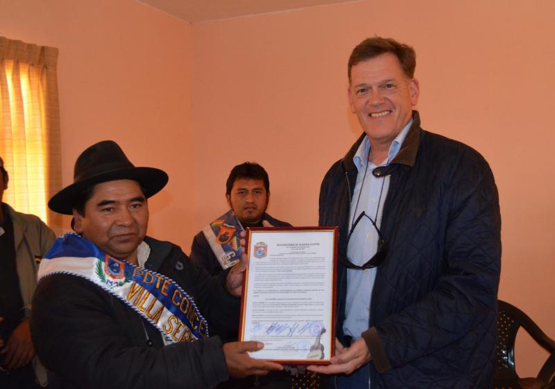 En la visita el Embajador de Suiza en Bolivia, Roger Denzer, fue nombrado huésped ilustre por parte del Honorable Consejo Municipal de Villa Serrano. En el reconocimiento se destaca la contribución a la educación técnica y productiva desde la gestión 2010, en el marco de las políticas públicas vigentes.