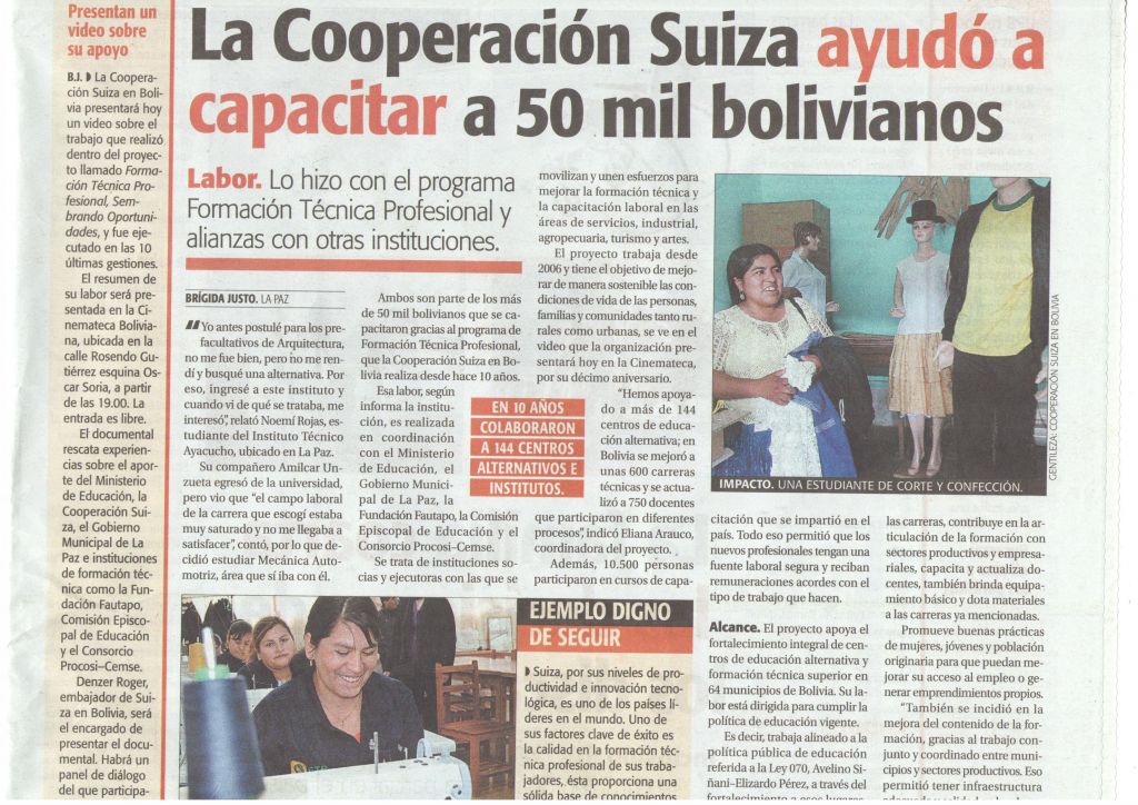 La Cooperación Suiza ayudó a la capacitación de 50 mil bolivianos