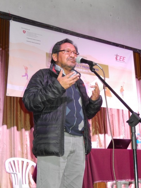 Noel Aguirre, Viceministro de Educación Alternativa y Especial, presentó su ponencia sobre las políticas en educación productiva en el Simposio Nacional “Educación técnica, tecnológica y productiva. Avances y perspectivas” que organizó la Comisión Episcopal de Educación. Aguirre expuso sobre la descolonización del sistema educativo  y la importancia de vincular las habilidades de los territorios con la forma de vida de sus habitantes.