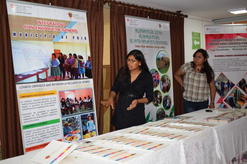 En la oportunidad se presentaron 9 experiencias en torno a género e interculturalidad: 1. De los pueblos indígenas Lecos ubicados en Apolo (La Paz) se presentó la experiencia “Mejoramiento del sistema de manejo integral del patio familiar en 15 comunidades”; 2. Del pueblo indígena Weehnayek en Villa Montes (Tarija) se explicó sobre las “Mujeres Weenhayek a orillas del río Pilcomayo”; 3. Del pueblo indígena Quechua se presentó la experiencia “Galletas de Janchicoco para el desayuno escolar de Presto (Chuquisaca);