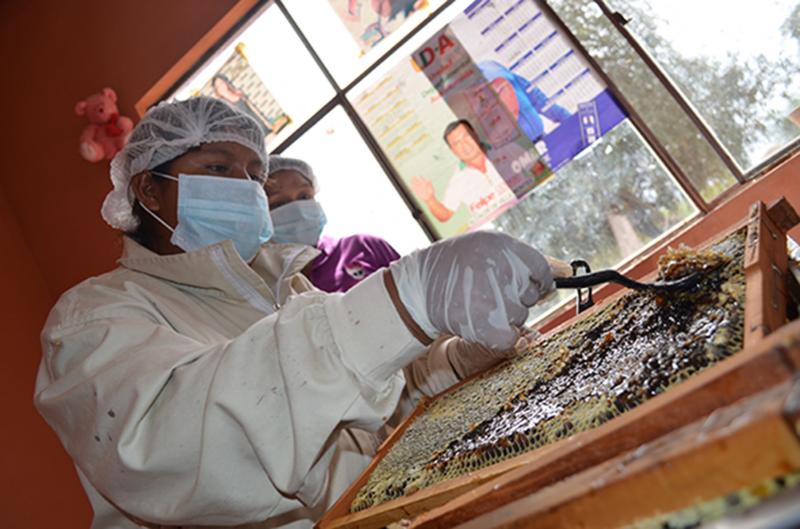 Las y los participantes, con mandil, mascarilla y gorro blanco, logran  un producto de calidad para el consumo.  Así en un espacio determinado para el empaque los(as) participantes cuentan con el equipamiento respectivo donde, luego de cosechar la miel del apiario, proceden con el raspaje de las celdas para aflojar la miel y, luego, pasan al centrifugado respectivo que permite extraer una miel deliciosa.  Luego, utilizando un tamiz, para una de las coladas,  garantizan quitar las impurezas de la miel.