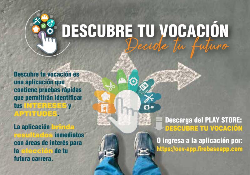 La aplicación puede ser descargada del PLAY STORE como: DESCUBRE TU VOCACIÓN y también se puede ingresar a la aplicación a través del enlace: https://oev-app.firebaseapp.com/