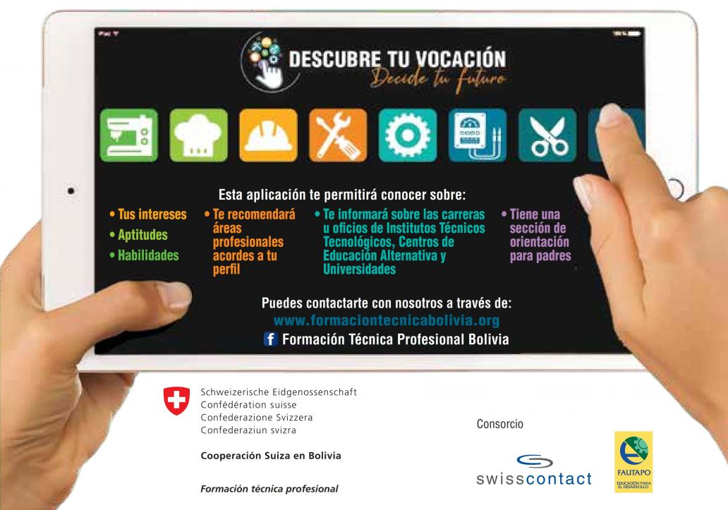 Finalmente mencionar que esta APP es una contribución del proyecto Formación técnica profesional de la Cooperación Suiza en Bolivia, que es ejecutado por el consorcio Swisscontact – FAUTAPO puesta a disponibilidad de toda persona joven que requiera una respuesta rápida y automática sobre su futura formación profesional.