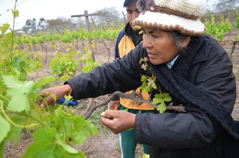 María Villarpando de la comunidad de Caisa indica que ha comenzado a podar y amarar algunas de sus viñas estos últimos días. "El trabajo de la uva es excelente", asegura. Rápidamente esta emprendedora, con mucha visión de futuro, se dio cuenta de las potencialidades de sus terrenos y empezó a capacitarse en viticultura. Se nutrió de conocimientos en el área y, a la fecha, satisfecha indica que logró hacer realidad su sueño, en un área tradicionalmente masculina.