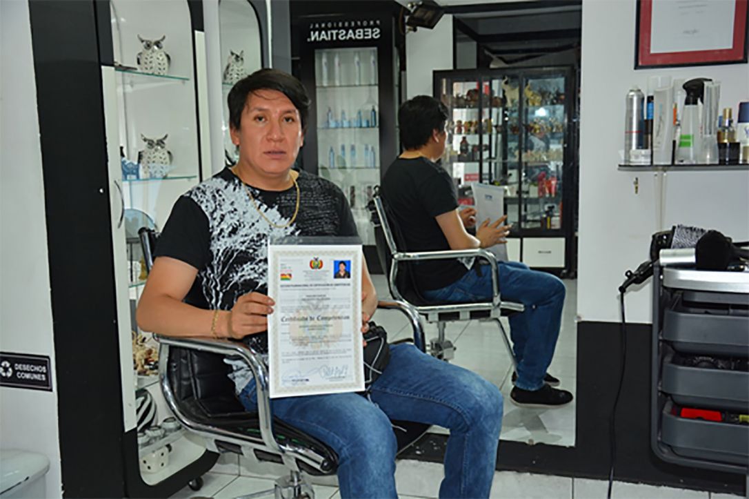 Recuerda que conoció al Sistema Plurinacional de Certificación de Competencias (SPCC), cuando fungía como presidente de la Asociación de Estilistas de Tarija y mediante el contacto de “Mujeres en Acción”, casi el 100 por ciento de los afiliados a esta Asociación cuentan con el Certificado de Competencias otorgado por el SPCC en representación del Estado de Bolivia, documento que lo firma la máxima autoridad de Educación del Estado Plurinacional de Bolivia y el Viceministro de Educación Alternativa y Especial, a la que pertenece el Programa de Certificación de Competencias.