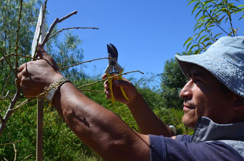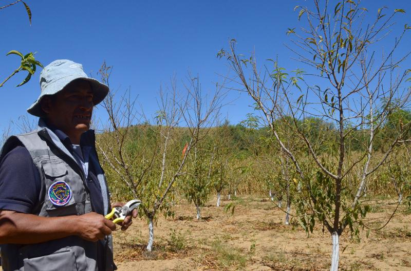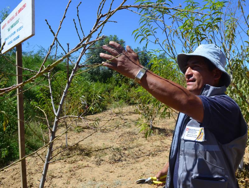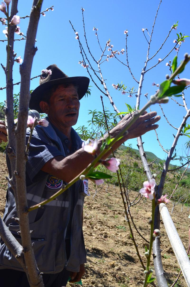 “Nos han proporcionado herramientas muy buenas y precisas para realizar las podas a los árboles” explica Valentín a tiempo de indicarnos que la orientación en el proceso de cultivo del duraznos tiene varios secretos como el colocar un buen abono orgánico en el momento de la plantación y lograr una adecuada fertilización, así como también ir formando  los árboles en forma de vaso o copa, lo que quiere decir que el árbol deberá contar con tres o cuatro brazos abiertos que le permitan absorber los rayos solares y otros nutrientes. La poda nos sirve para regular la carga de frutas que soportaría un árbol para no tener problemas en su producción”, explica Panoso.