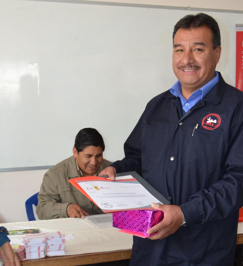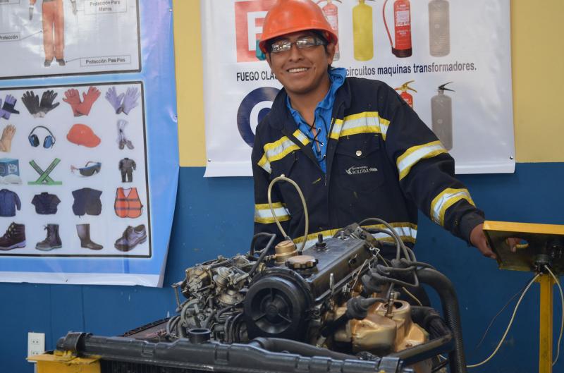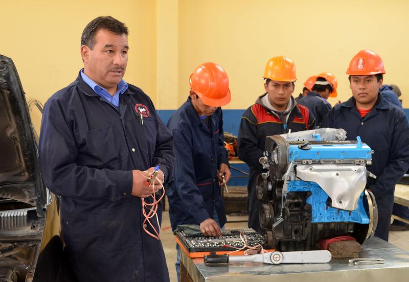 Manuel Aguilar Bustamante es un profesor que valora y enseña a sus estudiantes a que puedan construir sus propias herramientas de trabajo en la carrera de mecánica y electrónica automotriz. En cinco años de trabajo en el Instituto de Aprendizaje Industrial (IAI) de Oruro desarrolló, con sus estudiantes, una herramienta artesanal que les permite detectar las señales eléctricas o fallas de los vehículos a inyección electrónica, inventiva que también mereció un premio entregado por el proyecto Formación técnica profesional de la Cooperación Suiza en Bolivia.