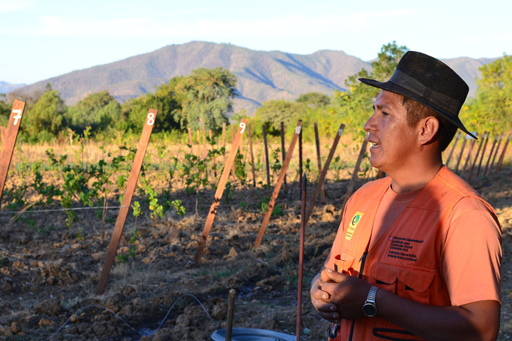 Los participantes de esta carrera aprenden en sus propios terrenos y el técnico facilitador es quien los visita una o dos veces por semana para brindarles la formación respectiva, tal es el caso de Royer Callata Rojas, quien desde hace nueve meses está trabajando en su propio terreno en los procesos que hacen al cultivo de la vid como el nivelado del terreno, trazado del marco de plantación, el plantado, el postaje para el sistema de conducción, el armado de los alambres y otros procesos productivo - formativos. “Tengo 1350 plantas de uvas, entre ellas la cardinal que es una uva de mesa grande y cara, la cabernet que sirve para la elaboración de vinos y la moscatel que puede ser para mesa, vino o singani”, nos indica Callata seguro de los aprendizajes obtenidos.