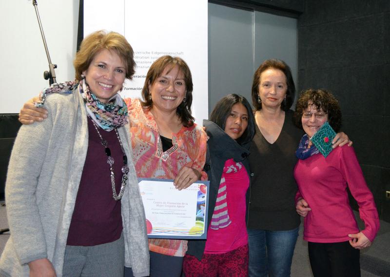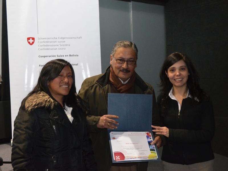 El proyecto Formación técnica profesional de la Cooperación Suiza en Bolivia entregó, en la ciudad de La Paz, reconocimientos al Centro de Promoción de la Mujer Gregoria Apaza y Red Hábitat por haber sido seleccionadas como instituciones ejemplares en la formación de mujeres e inserción a mercados laborales en el marco del concurso “Para muestra basta un botón”.