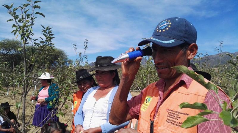 Pedro Rodas quien hace uso de un refractrómetro verifica, delante de los visitantes, que la manzana esté madura para poder cosecharla.  Nos indica que si llega a 14 grados quiere decir que está lista para  su cosecha. Como lo menciona Pedro, este año cada planta produjó 40 kilos, lo que significa 2 arrobas por árbol y un logro de 142 arrobas de todos los árboles con los que cuenta. De ese total, vendió el 40% y eso le significó un ingreso neto de Bs. 5.300. Ha recibido el apoyo de la Alcaldía para poder llevar las manzanas al mercado local y venderlas, agrega. El resto se quedó para el consumo de su familia  y también hizo trueque para obtener otros productos.