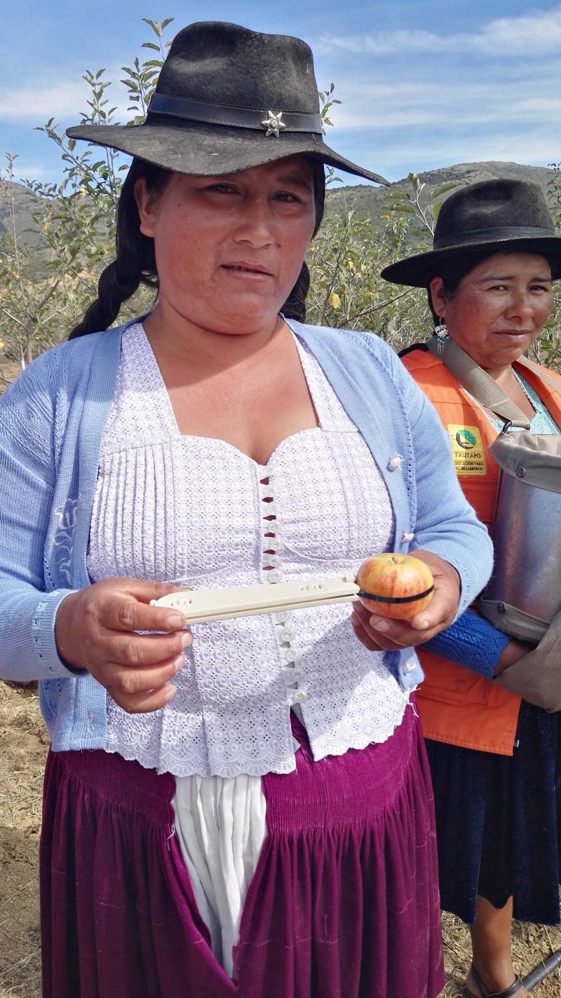 Una productora de manzana, sostiene un calibrador manual, el mismo que fue comprado en del concurso lanzado por Fondo Equidad y  por ser una Buena Práctica seleccionada desde el mismo  Fondo. El calibrador les sirve para medir el tamaño de la manzana y saber el peso, de acuerdo a esos datos se hace la selección de las manzadas que se venderán en el mercado.