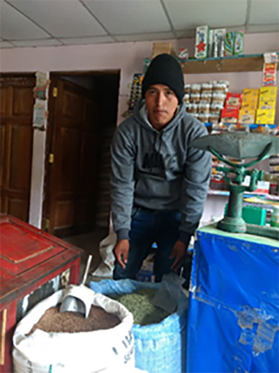 Julián Pucho Limachi atiende el puesto de venta de la Cooperativa, un negocio surtido donde uno puede encontrar semillas, fertilizantes, medicamentos para combatir plagas y enfermedades en plantas, vacunas y medicinas para el ganado; pero también abarrotes, jabones, etc. La Cooperativa tiene 85 socios afiliados, hombres y mujeres, la mayoría de ellos(as) agricultores que sólo lograron estudiar hasta primaria, algunos no tuvieron esta oportunidad.