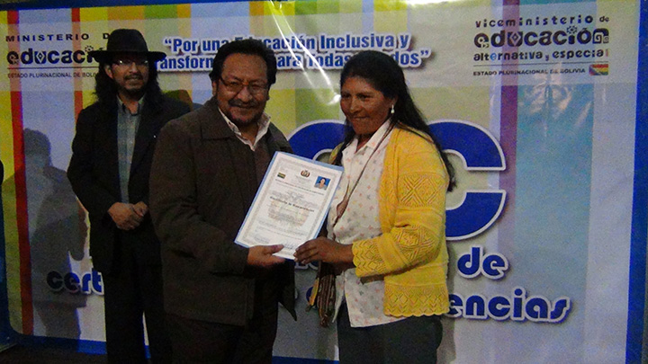 “Nunca habíamos recibido un certificado y ahora pienso seguir capacitándome para luchar por los derechos de mi comunidad”, expresó Arminda Vargas Quispe, una mujer del Municipio de Sica Sica quien recibió el certificado de Gestora Comunitaria en Derechos en el evento de relanzamiento del Sistema Plurinacional de Certificación de Competencias (SPCC) que se realizó el día de ayer.