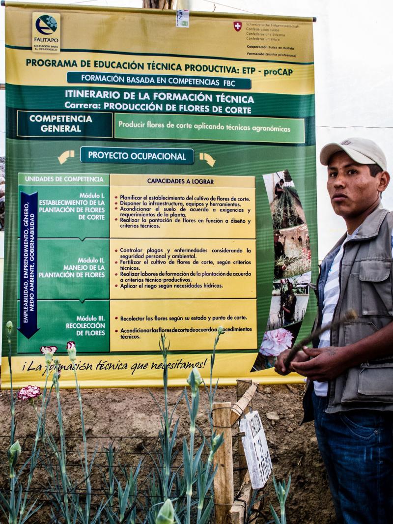 Bajo la modalidad de producción con formación, la Fundación FAUTAPO, con el apoyo del proyecto de Formación técnica profesional de la Cooperación Suiza en Bolivia, impulsa en Yotala (Chuquisaca) la carrera de producción de Flores de corte.  Las participantes reciben la asistencia técnica personalizada en sus propios invernaderos.